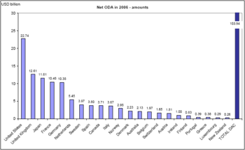 En chiffres absolus, le premier pays donateur en 2007 était les États-Unis avec 21,7 milliards, devant l'Allemagne (12,3), la France (9,9), le Royaume-Uni (9,9) et le Japon (7,7)[3]. Les pays de l'OCDE consacrent en moyenne 0,45 % de leur PIB à l'aide publique au développement[4].