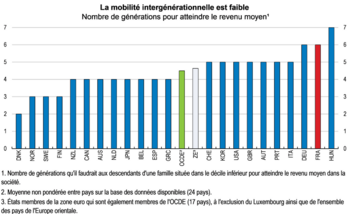 « Ces résultats soulignent notamment que l’ascenseur social fonctionne mieux dans les pays riches que dans les pays pauvres et que son efficacité n’est pas nécessairement liée à l’importance de la redistribution publique : la moitié des pays dans lesquels le rattrapage à la moyenne des revenus se fait en quatre générations a des prélèvements obligatoires inférieurs à 35 % (chiffres OCDE) du PIB en 2021 (Australie, Canada, Japon, et Nouvelle Zélande). Les États-Unis, où il faut cinq générations, ont des prélèvements obligatoires de 28,58 % alors que la France, où il en faut six, a des prélèvements obligatoires de 45,15 %. »