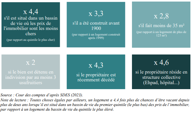 Causes de la vacance durable des logements. Source : Cour des Comptes, 2025 https://www.ccomptes.fr/sites/default/files/2025-05/20250522-S2025-0608-Lutte-contre-logements-vacants-dans-le-parc-prive.pdf