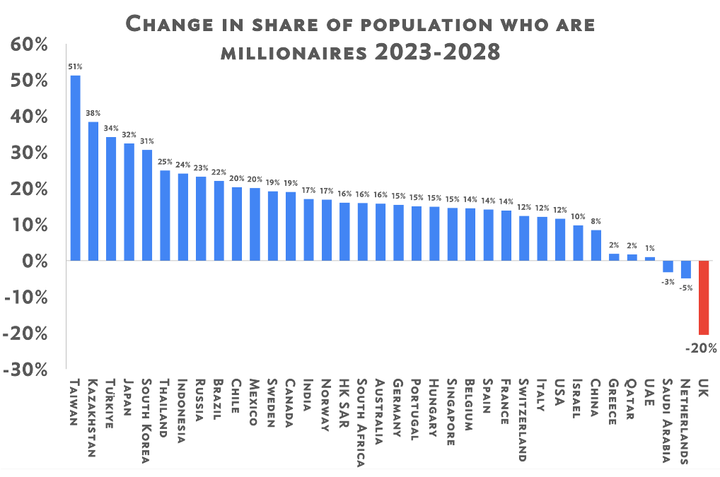 Evolution 2023 - 2028 du pourcentage de la population étant millionaire