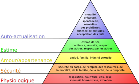 La Pyramide de Maslow est une représentation pyramidale de la hiérarchie des besoins réalisée dans les années 1940 par le psychologue Abraham Maslow. Elle présente en bas de la pyramide les besoins physiologiques (respirer, manger, boire, etc.), puis les besoins de sécurité (du corps, de l'emploi, de la famille, etc.) jusqu'à l'amour / appartenance, à l'estime de soi et enfin à l'accomplissement de soi.