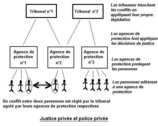 Dans une telle société il pourrait y avoir beaucoup de tribunaux et même beaucoup de systèmes légaux. Chaque paire d'agences de protection convient à l'avance quel tribunal elle invoquera en cas de conflit. Ainsi, les lois en vertu desquelles sera traité un cas particulier seront déterminées implicitement par l'accord anticipé entre les agences de protection des clients concernés. En principe, il pourrait y avoir un tribunal différent et un système de lois différent pour chaque paire d'agences de protection. Dans la pratique, beaucoup d'agences trouveront probablement commode de traiter avec les mêmes tribunaux, et beaucoup de tribunaux pourraient trouver commode d'adopter des législations identiques ou presque identiques, afin de simplifier les affaires avec leurs clients.